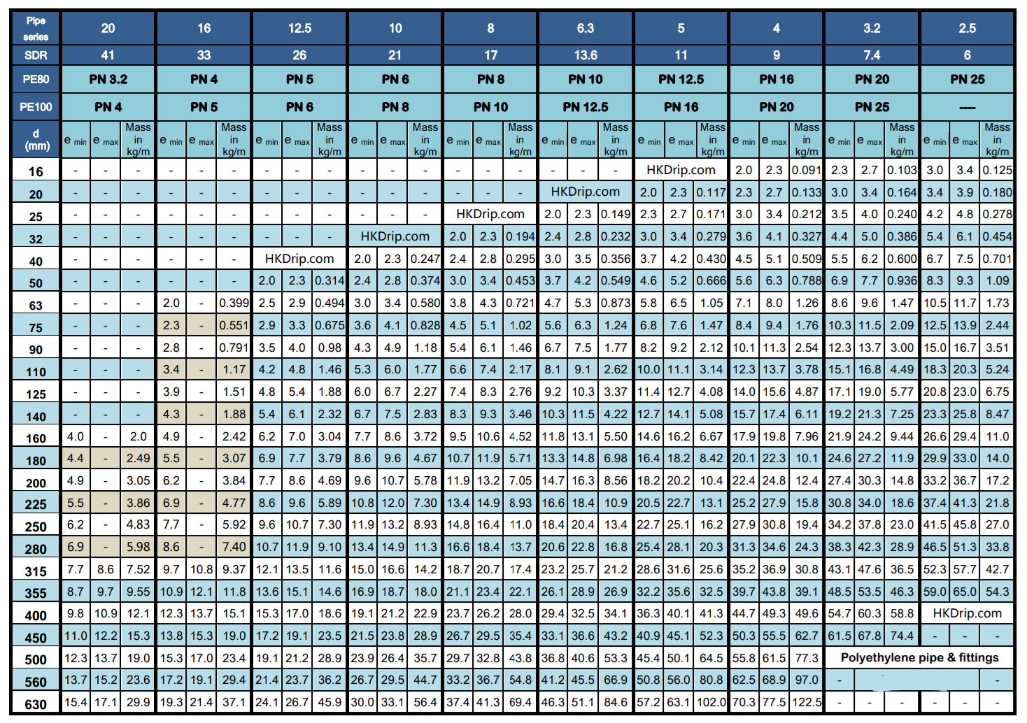 جدول استاندارد مشخصات لوله های پلی اتیلن